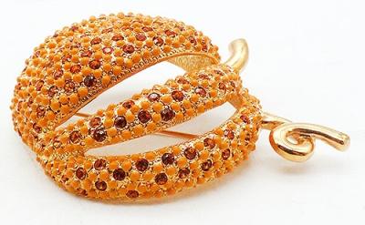 Description: Daniel Lyons gold plated domed pumpkin brooch made exclusively for Uno Alla Volta London. The large 23k gold plated pumpkin set with orange Swarovski crystals between orange enamel beads. Comes in its original Uno Alla Volta purple presentation pouch.