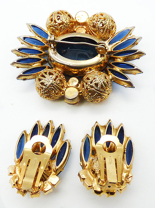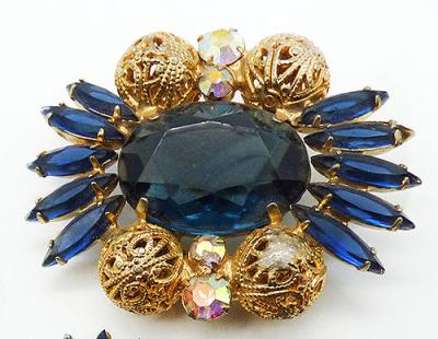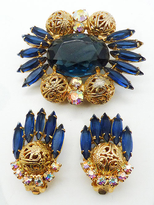 Description: Juliana deep nlue rhinestones and gold tone filigree bead brooch and mtching clip earrings set; the lsrge oval blue glass center stone of the brooch has a fan of blue thin navette rhinestones to each side and pairs of crystal aurora rhinestones between gold tone filigree beads above and below.The earrigs have a fan of blue thin navettes above a single bead with a curve of crystal auroras below. Confirmed Juliana DeLizza and Elster.