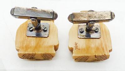 Description: Antique and very rare Japanese signed sterling silver and carved bone Fukurokuju netsuke cuff links; each natural and dyed bone cuff link is a statue depicting the Japanese God Fukurokuju, God of Wisdom. He is in robes and a hat, has a long beard and is holding a crane and a staff. These come in the original blue velvet lined gray presentation box which hinged on either side. Metal links test positive for sterling. There is an artist's mark on the back of one link, in Japanese.