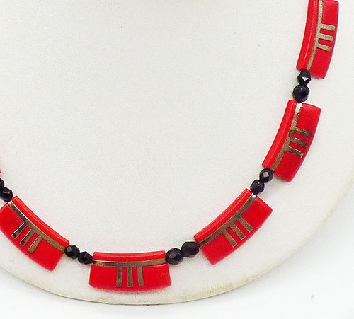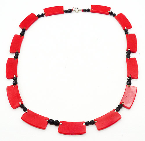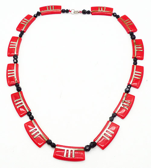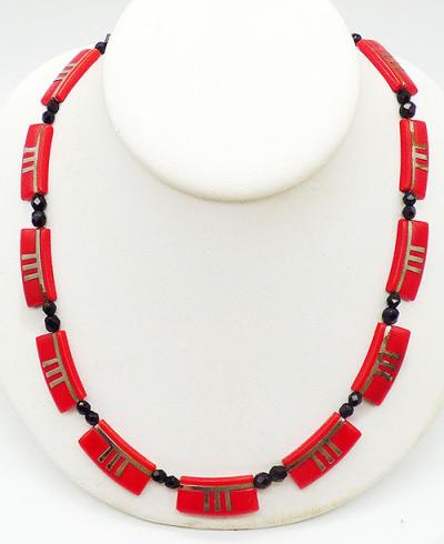 Description: Art Deco period opaque red glass beads necklace; each of the slightly curved flat beads has a silver flat wire inlaid horizontally towards the top with three vertical stripes in the middle. The beads are strung on red silk with pairs of black faceted glass beads between.
