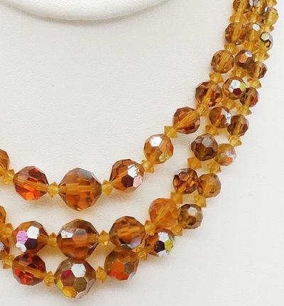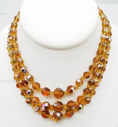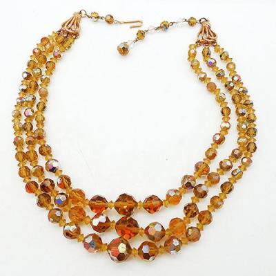 Description: Topaz crystal bead triple strand necklace; three strands of gradated size topaz aurora faceted crystal beads with small pale gold bicone crystal spacers throughout. Strands attach to gold tone loops connectors with crystal and clear bead extender chain on one end and hook clasp on the other.