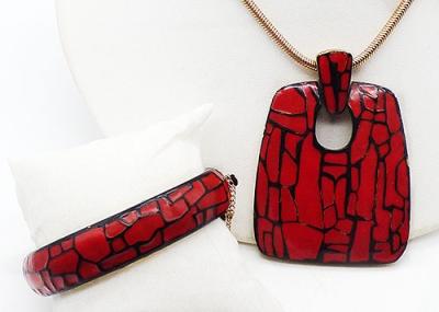 Description: Eisenberg vintage red and black enamel gold plated pendant necklace and hinged bracelet demi-parure set from the 1970's Artist's Series. Both pieces have bold red enamel with an abstract crackle pattern in black. The pendant is a slightly tapered door knocker style rectangle on a gold tone snake chain. The bracelet is hinged on the side with a hidden push-in clasp and safety chain. Both pieces signed 'Eisenberg©'.