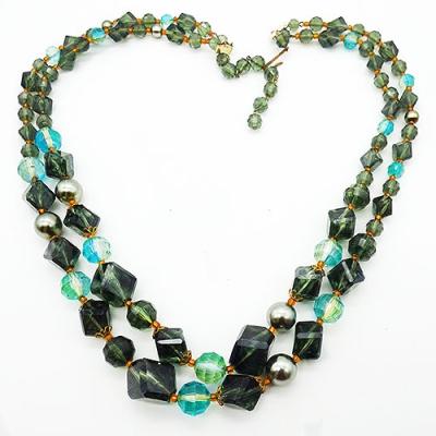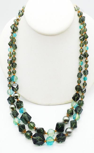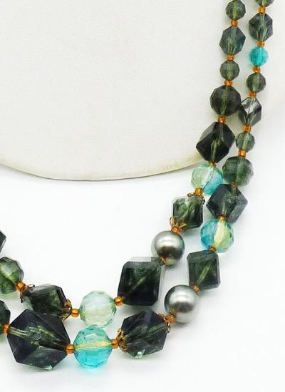 Description: West German vintage dark grayish green plastic bead double strand necklace; larger graduated size gray-green angled cube beads are spaced with round faceted beads, slightly larger round faceted aqua plastic beads and a few faux Tahitian pearl beads. Small topaz spacer beads throughout. Strands attach to gold tone connectors with an extender chain on one side and hook clasp signed 'W Germany; on the other.