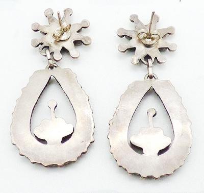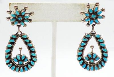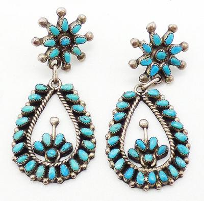 Description: Zuni vintage turquoise petit point sterling silver pierced post earrings; a teardrop shaped dangle with a half floret inside hangs from a traditional flower design at the top, all bezel set with tiny turquoise teardrop stones. The inside of the dangle is edged with twisted sterling wire and the flower petals and outer edge of the drop have silver bead detail. Tests positive for sterling.