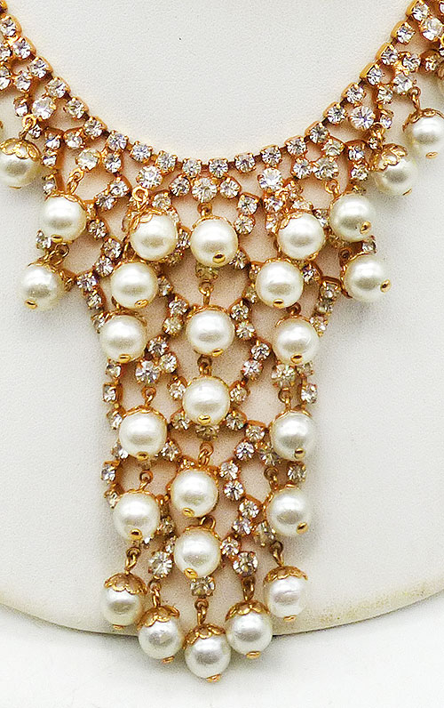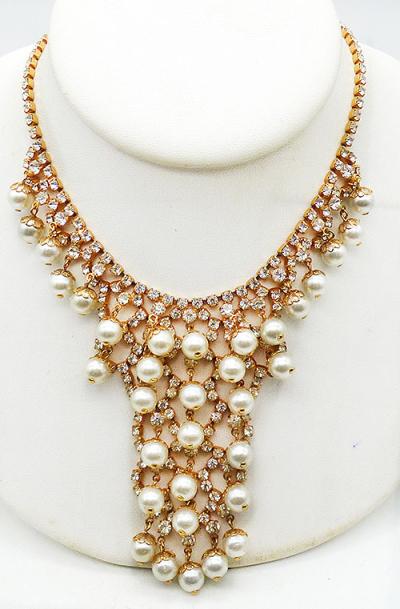 Description: Vintage gold plated cess rhinestone and fur pearl dangle bib necklace; white faux pearls hang from the ends of clear rhinestone scallops that create the leg narrow column center focus. More pearls dangle along a second row of rhinestones on either side of the column and then the necklace is finished with clear rhinestone chain. Hook closure on one side.