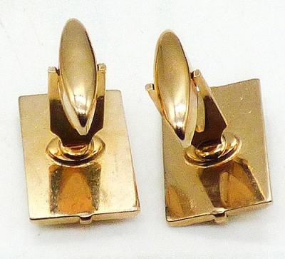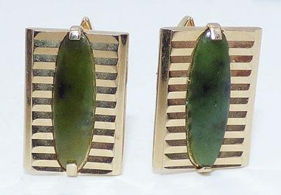 Description: Swank vintage gold tone and jade mid-century cuff links; rectangular links with horizontal grooves and a long, narrow elliptical jade stone set vertically in each center. Signed on the back of the links with the Swank 'S' mark.