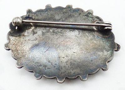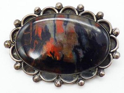 Description: Native American vintage sterling silver and landscape agate brooch; a flat oval black, gray and red landscape, or picture, agate stone is bezel set in a sterling frame with a scallop and bead border. Tests positive for sterling,