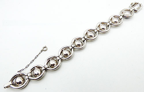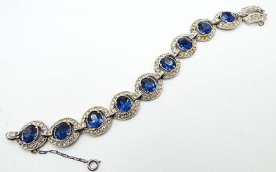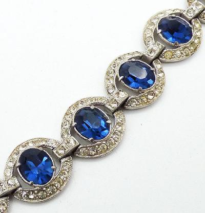Description: Art Deco silver plated clear and sapphire blue geometric link bracelet; a total of nine round links with a single rectangular link on one end. The round links have a large sapphire blue round rhinestone center inside a ring of clear rhinestones. The last rectsngular link is part of the clasp and is set with clear rhinestones. The connecting links and fold-over clasp are set with pairs of clear rhinestones. Silver tone safety chain.