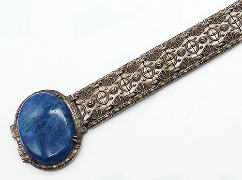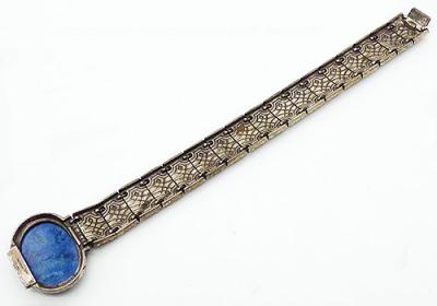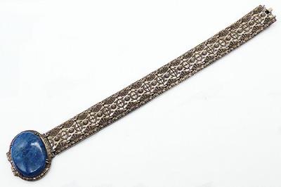 Description: Wachenheimer Art Deco period sterling and lapis lazuli bracelet; the band is stapmed sterling panel links with intricate silver cannetille, beads and wire decoration. The clasp is hidden beneath the large oval natual lapis flat cabochon set into an embossed oval frame. Signed 'Wachenheimer Sterling' on the back of the clasp.