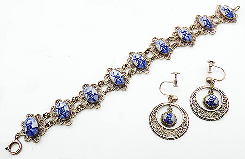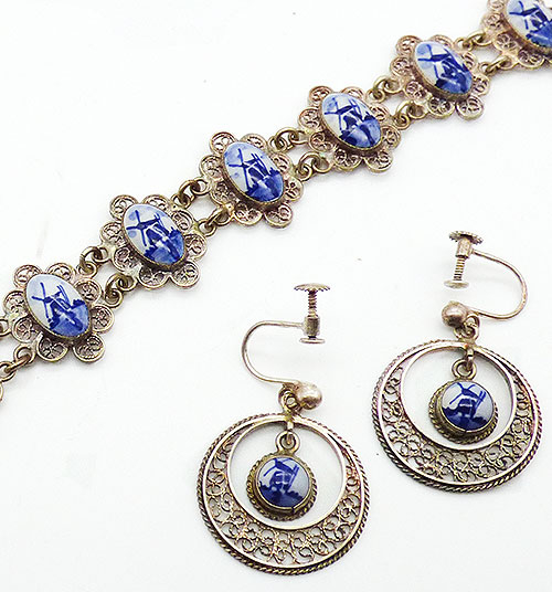 Description: Vintage Dutch Delft porcelain and silver filigree link bracelet and dangle screw post earrings. Each of the nine bracelet links have a classic oval blue and white Delft windmill cabochon in a silver filigree frame, spring ring claso. The screw post earrings have a round Delft cabochon dangling inside a round filigree hoop hanging from the silver posts. Signed 'Delft' on the back of each oval cabochon in the bracelet with additional markings on the bracelet clasop that are illigible.