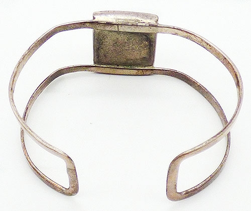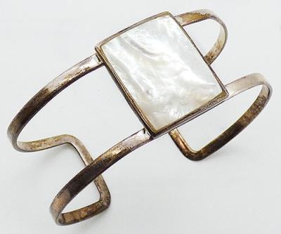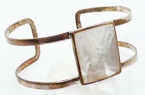 Description: Sterling silver and mother-of-pearl vintage cuff bracelet; a larger square piece of white mother-of-pearl bezel set in the center of the band made with flat sterling wire. Hallmarked '925' in the back of the wire.