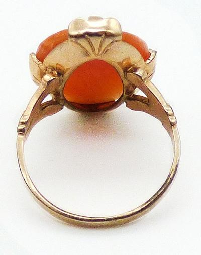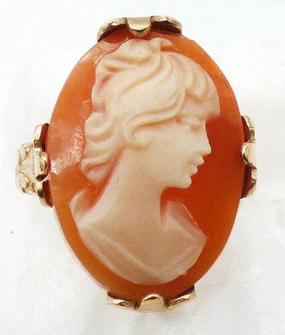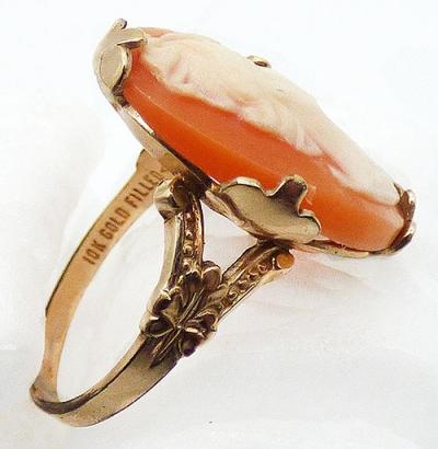 Description: Vintage 10k gold filled shell cameo ring; a right-facing young woman carved from shell and set with four wide leafy prongs. The band is decorated with a leaf on each side below the cameo. Hallmarked 10K gold filled' inside the band.