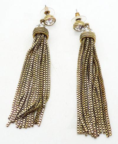 Description: Heidi Daus Clea crystal and gold tone chain long tassel pierced post earrings; fifteen square link chains from the tassel hanging from inside a dome of clear crystals. The tassel swings from a large round crystal at the post. Signed 'Heidi Daus CN' around the edge of the posts.