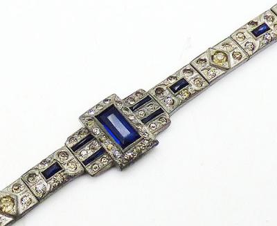 Description: Nov-E-Line Art Deco period silver base metal rhinestone bracelet; the center link has a large very dark navy or Montana blue baguette surrounded by clear rhinestones with alternating horizontal rows of clear rhinestones and smaller blue baguettes. The band has interlocking rectangular rhinestone links set a navy blue baguette in the center alternating or alternating with a diamond shape in the center. Hidden push-in clasp. Signed 'Nov-E-Line' on the back of the clasp.