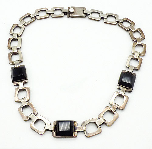 Description: Heavy Mexican sterling silver modernist necklace is made of substantial square links with round holes and three square pieces of black onyx which are set on flat links and spaced across the lower half of the necklace. Possible later work of Ana Nunez Brilanti, Victoria de Taxco, whose post-1980's work would be marked TS-64. Signed '925', 'Mexico' and 'T?-64" on the back of the clasp.