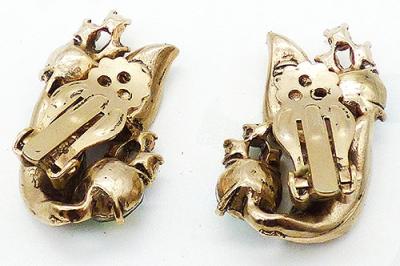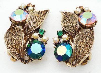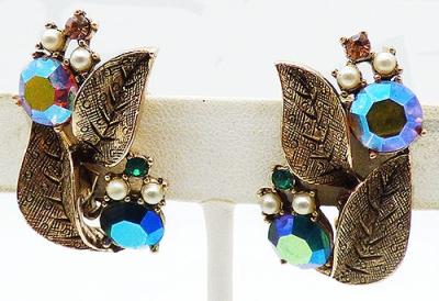 Description: Vintage textured gold tone leaves and aurora borealis rhinestone clip earrings; a pair of realistically textured leaves with a large topaz aurora above and an emerald aurora rhinestone below. A pair of small faux pearls and a matching rhinestone is above each aurora.