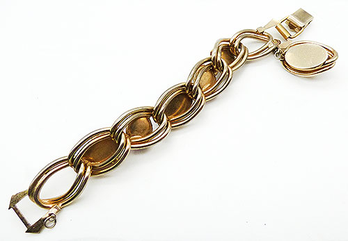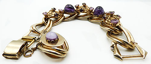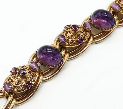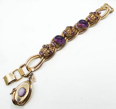 Description: Kafin vintage gold plated double link bracelet three links decorated with dimensional gold tone filigree set with amrthyst rhinestones and oval light amethyst glass moonstone ovals alternate with two large oval amethyst bullet cabochons. A large gold tone link hangs from one end near the fold-over clasp with a light amethyst oval glass moonstone in the center. Signed 'Kafin New York' on a hang tag at the dafety chain.