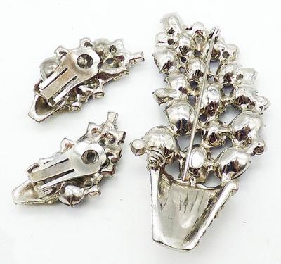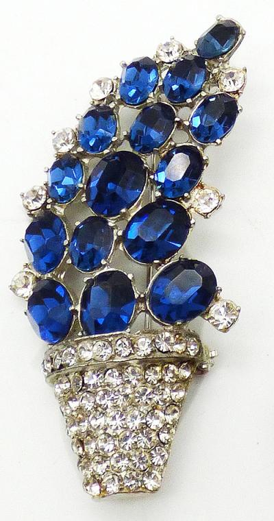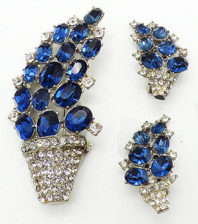 Description: Vintage silver plate clear and sapphire blue rhinestone flower basket brooch and clip earrings set; a tall tower of sapphire blue oval rhinestone flowers with clear rhinestone accents sits inside a clear rhinestone pot or basket. The matching earrings are smaller versions of the brooch.
