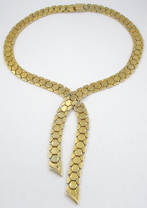 Description: Trifarigold tone honeycomb lariat necklace, advertised in 1946, a design using a flat gold plated chain made of interlocking honeycomb links. The chain overlaps and crosses (attached with a screw from the back so ends swivel) in front, the ends are uneven lengths in a negligee style. Hidden push-in clasp. Signed 'Trifari' (with crown) 'Pat Pend' on the clasp.