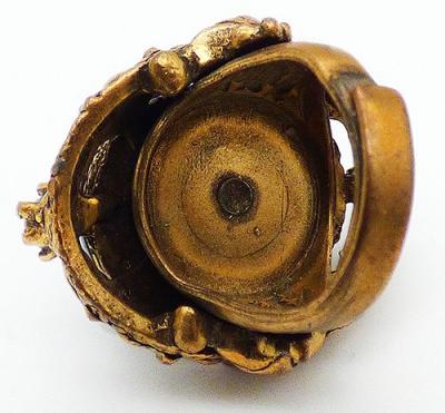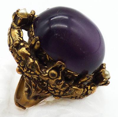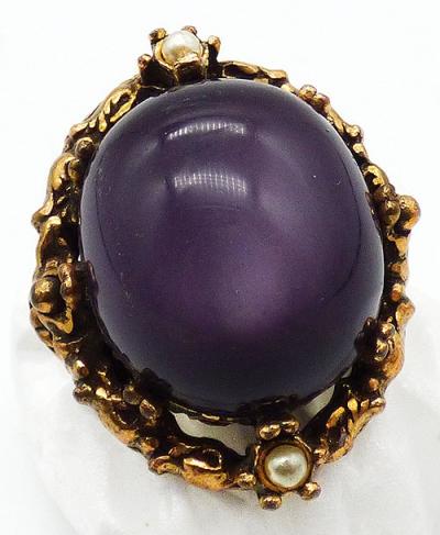 Description: Selro (or Selini) gold tone purple moonglow cabochon vintage costume ring; a huge domed deep purple moonglow lucite oval cabochon is mounted onto a thick embossed setting with wide prongs. The base of the ring is embossed with a layer of tiny flowers along the sides and is set with a pair of faux seed pearls. Adjustable band. Attributed Selro or Selini.