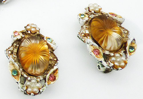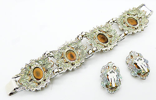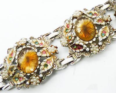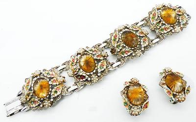 Description: Florenza white washed enamel leaves and molded topaz and clear givré glass bracelet and clip earrings set, the stones are known as satin pillow glass stones. Each of the four large links are enameled in an antiqued white with large oval satin pillow stones in the center between trios of leaves set with small aqua and pink rhinestones and faux pearl florets in four places aroundf the links. Fold-over clasp. The earrings are smaller versions of the links, with a satin pillow stone between pairs od leaves and a pair of pearl florets. Arrtibuted Florenza.