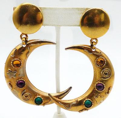 Description: Edouard Rambaud vintage gold plated oversized dangling crescent clip earrings; each is decorated with a golden topaz, amethyst and emerald green glass cabochon along with an embossed star, spiral and squiggles. The crescent hangs from a flat disc at the top. Signed 'Edouard Rambaud Paris' on the backs.