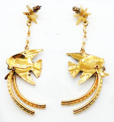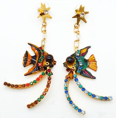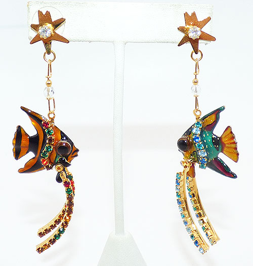 Description: Lunch at the Ritz vintage gold plated enameled angel fish pierced post earrings; each fish is a different color scheme for an asymmetrical look. One fish is enameed with dark brown and gold enamel stripes with a row of green, orange, golden topaz and darker topaz rhinestones down the middle and a brown glass eye. The two dangling trails are set with the same color stones and the fish hangs from a gold tone chain attached to a star wth a clear rhinestones center. The other fish is enameled in gold, brown and turquoise with a turquoise stripe next to a row of aqua, light blue and sapphire blue rhinestones and a brown glass eye. Those same color stones are in the two dangling trials and the fish hangs from the same chain and star. Signed 'Lunch at the Ritz' on a plaque on the back.