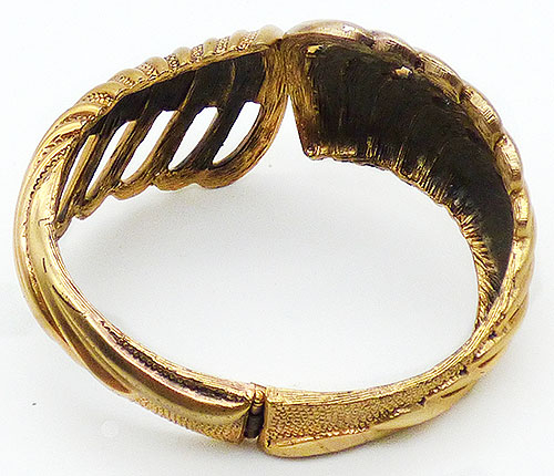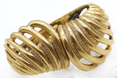 Description: Tortolani vintage gold tone hinged clamper bracelet; an open wave design layered over a textured granulated band. The opening is in top, hinge on the bottom. Signed 'Tortolan©' on the inside.