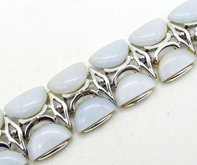 Description: Vintage mid-century pale gray moonglow lucite silver tone link bracelet; a total of nine links inset with back-to-back ultra pale cloudy gray semi-circles. Fold-over clasp.