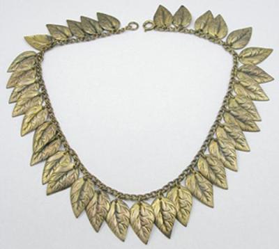 Description: Vintage brass leaves necklace; a total of 34 embossed brass leaves dangling from the brass chain. Stunning!