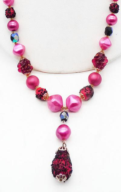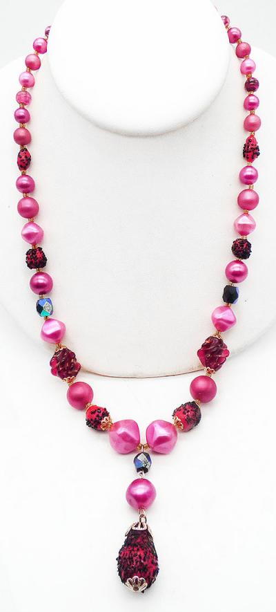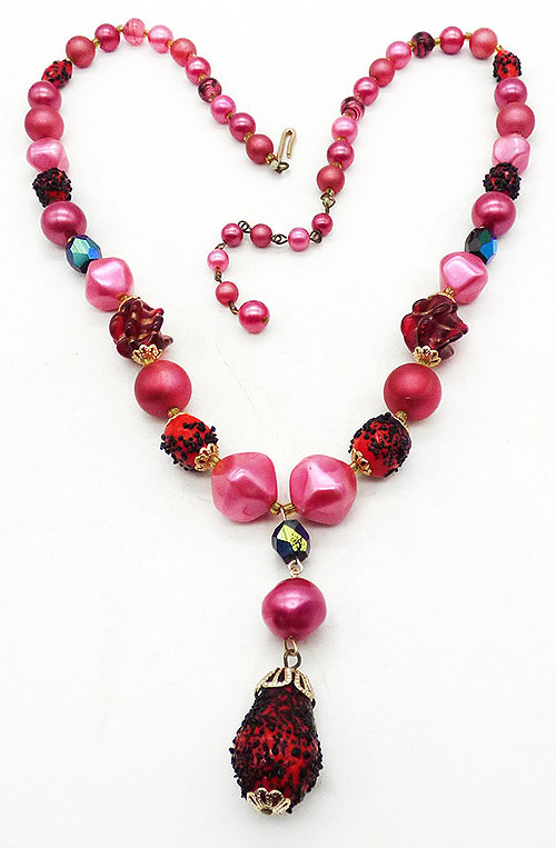 Description: Japan vintage pink faux pearl and red art glass single strand necklace; a combination of pink and raspberry faux pearls with red and black granules art glass beads, round deep maroon glass bead, deep deep red faceted crystal beads and large twisted red with gold fluss art glass beads spaced throughout. The drop in front is a strand of one red crystal, a large raspberry pearl and an extra large red and black art glass bead. Signed 'Japan' on tthe hook clasp.