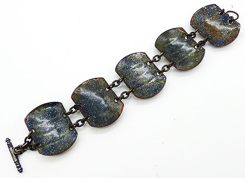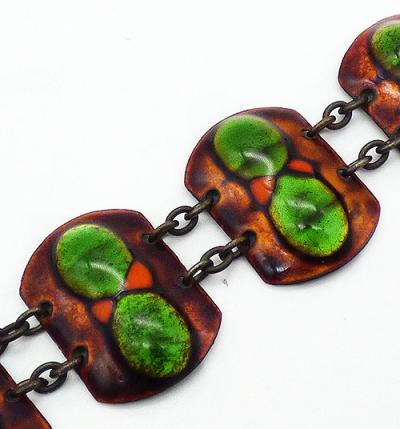 Description: Vintage mid-century fused glass and enameled copper link toggle bracelet; each of the five links has a pair of green fused glass ovals with orange enameled triangles between. The rest is enameled burnt orange and deep brown. Links are connected with double chain and thee's a toggle clasp.