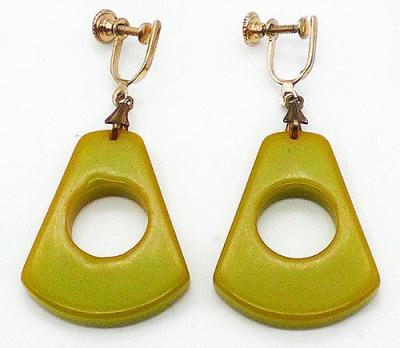 Description: Vintage pea rope green bakelite screw post earrings; pie-shaped pea green bakelite pieces have circles cut outs in the center and hang from gold tone screw posts.