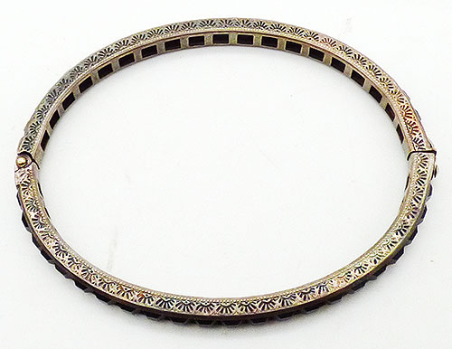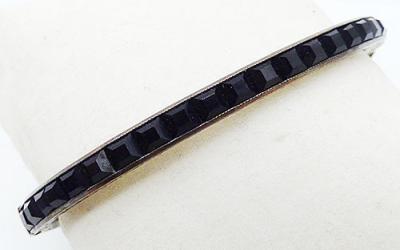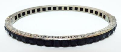 Description: Art Deco sterling silver black rhinestone hinged bracelet; a single row of square black rhinestones channel set into the sterling bracelet which is etched with a sun design along the sides and open at the back allowing light to hit the stones. Hinged on one side, with a push in clasp and swivel safety catch on the other. Marked 'Sterling' on the inside.