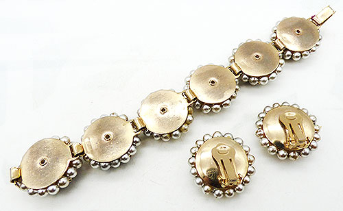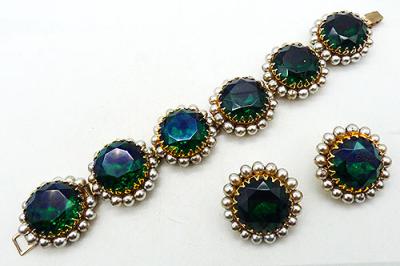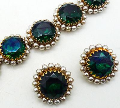 Description: Emerald green headlight rhinestone and simulated pearl vintage bracelet and clip earrings set; the bracelet has six round gold tone links with dog tooth prong set huge emerald green round rhinestones ringed by a row of white faux pearls. Fold-over clasp. The matching earrings are identical to the links.