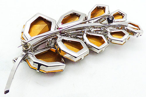 Description: Vintage amethyst and emerald gammatic glass stone leaf brooch; the graduated size faceted bi-color purple and green stones are set along a silver tone stem lined with emerald green round and baguette rhinestones.