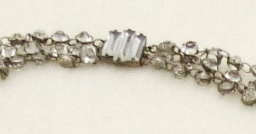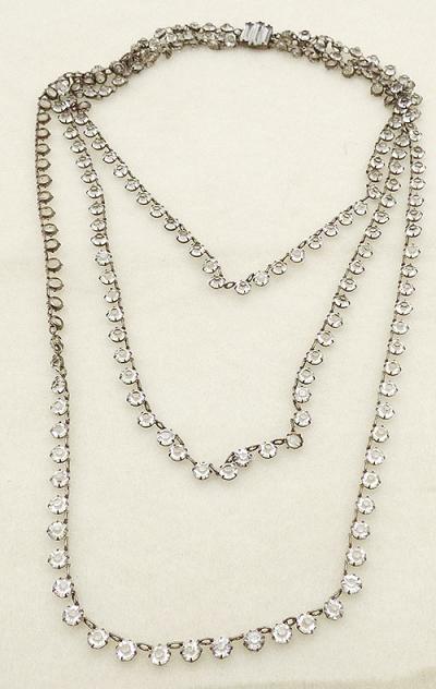 Description: Art Deco antique sterling silver and clear rhinestone triple tired necklace; the three strands consist of clear unfoiled rhinestones in linked individual open back settings. The strands attach to a sterling hidden push-in clasp set with three clear rhinestone baguettes. Hallmarked 'Sterling' on the back of the clasp.