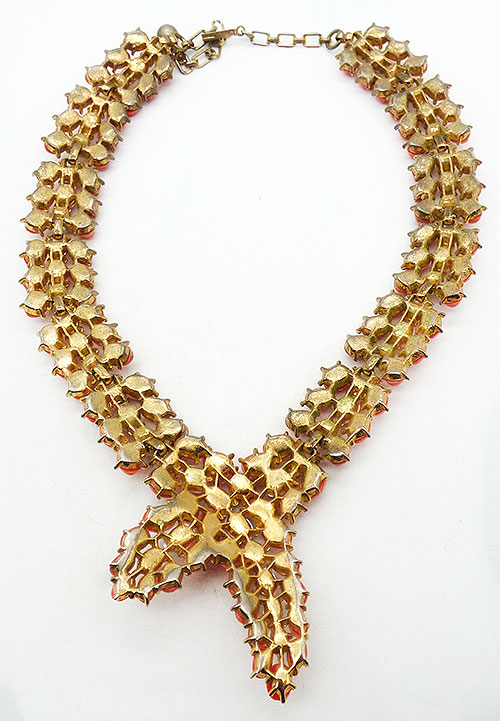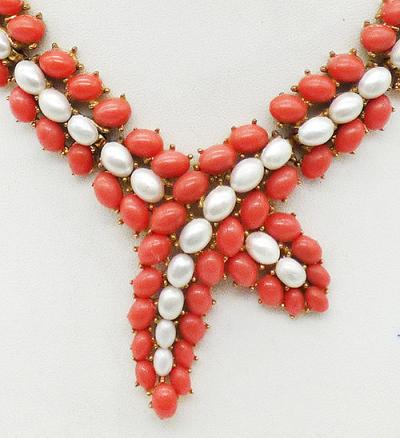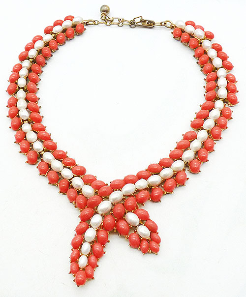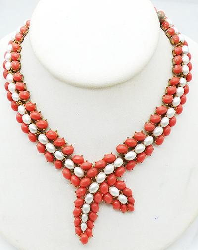 Description: Trifari vintage faux coral and pearl gold plated lariat style necklace; links made with a row of oval faux pearls between rows of faux coral oval cabochons. The links connect and then cross into overlapping ends in the center. Gold tone chain on either side of the links at the top with hook clasp on one end. Signed 'Trifari' on the hook.