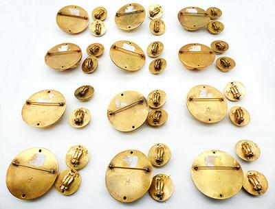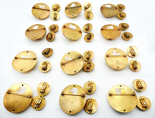 Size: Each brooch: 2 1/8" dia, earrings: 1 1/8" dia.