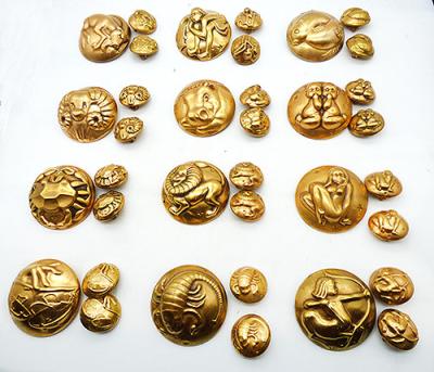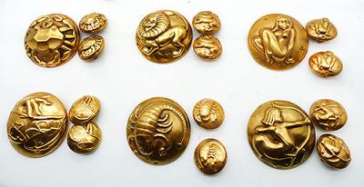 Description: Joseff of Hollywood vintage Zodiac Series extremely rare complete set of all twelve months, the matching brooches and clip earrings for each sign. This set was purchased by the original collector from the late 1940's through early 50's at Bullocks Wilshire in L.A. There is a gold plated round domed brooch and matching smaller domed earring for each month of the Zodiac. They are arranged in the picture with Capricorn at the top left and then left to right, top to bottom until Sagittarius bottom right. The Astrological signs are Capricorn (goat), Aquarius (water bearer) Picses (fish), Aries (ram), Taurus (bull), Gemini (twins), Cancer (crab), Leo (lion), Virgo (maiden), Libra (hand on scales), Scorpio (scorpion), Sagittarius (centaur). All pieces are signed 'Joseff' on the back.