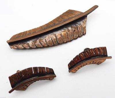 Description: Vintage Rebajes banana leaf brooch and matching screw back earrings; a deep burnished copper with thickly etched details. Shown on page 19 of "Copper Art Jewelry" by Matthew Burkholz. Signed 'Rebajes' on all pieces.