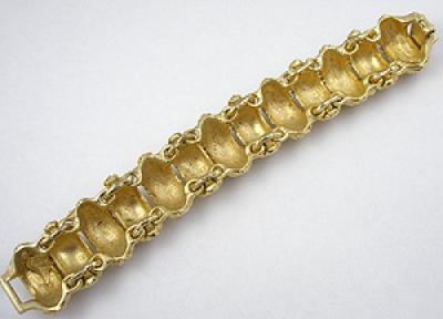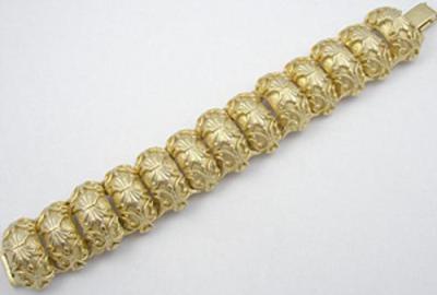 Description: Tortolani chunky, heavily decorated gold plated link bracelet, each of the thirteen curved links stamped with an intricate 3-dimensional design. Signed '©Tortolani' on the back.
