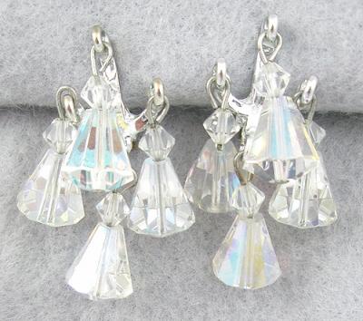 Description: Vintage silver tone chandelier clip earrings with four dangling bell shaped crystal aurora beads, each bead combined with a smaller crystal bicone bead.