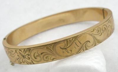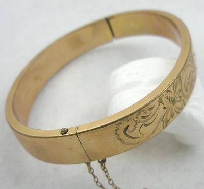 Description:  Victorian L.M. & Co etched gold filled hinged bangle bracelet. The top half is etched with flowers and scrolls pattern and the name Ruth engraved in the center. Knob closure with gold filled safety chain. Signed 'L.M. & Co on the inside.