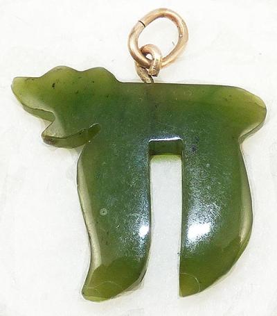 Description: Vintage carved jade Chai pendant; beautiful translucent green nephrite jade. Chai is the Hebrew word for 'life', symbolic in Judaism. Gold tone bail and jump ring for a chain.