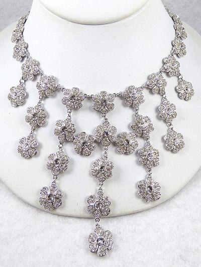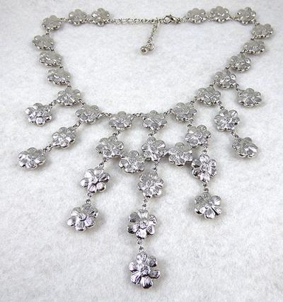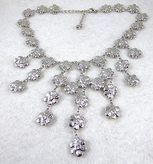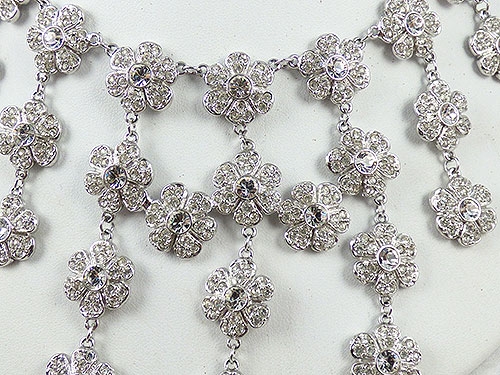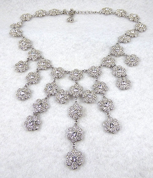 Description: Kenneth Lane new, contemporary crystal flowers bib necklace; each of the silver plated flowers have petals set with a trio of crystal clear rhinestone around a larger crystal rhinestone center. The flowers are linked in dripping graduated length strands in front to form waterfall bib design, and also are linked to create the necklace chain with silver tone extender chain on one side, lobster clasp on the other. Signed 'Kenneth Lane©' on a hang tag next to the clasp.