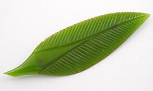 Description: Exceptionally large bright grass green vintage bakelite leaf brooch with finely carved ridges across most of the very long leaf.