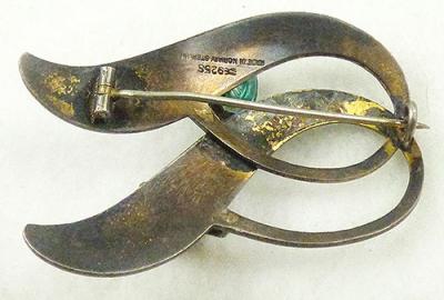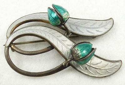 Description: Vintage Aksel Holmsen enamel over gilded sterling tulip brooch; each green enameled tulip is curled over a long white basse taille enameled leaf. Signed with the Aksel Holmsen mark, '925S' and 'Made in Norway Sterling' on the back.