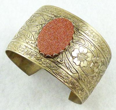 Description: Vintage 1970's gold tone cuff bracelet; the wide band is etched with a banded floral design so popular at the time and used as the base for many designs. This cuff is decorated with a flat oval goldstone glass stone.