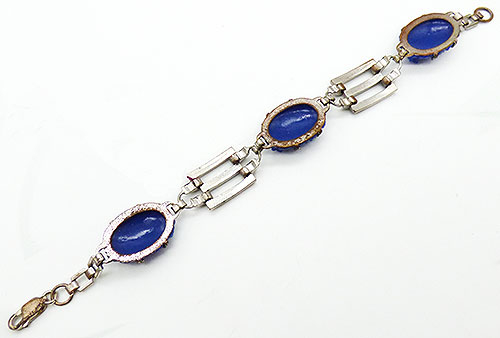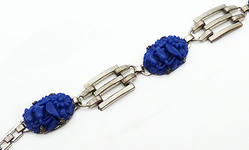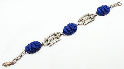 Description: Art Deco period silver metal blue molded glass bracelet; the three oval lapis blue glass stones are moled with a flowers and leaves design and are prong set onto silver frames. They alternatie with silver tank track style links and the bracelet is finished with square link chain. Elongated spring ring clasp.